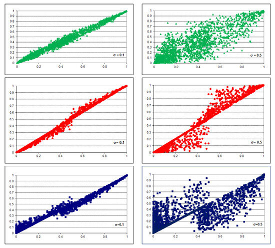 The noise introduced using the above method is symmetric in the sense of the value of every parameter changing symmetrically around its original value (see Figure 3, which shows scatterplots of transformed parameters vs. the original parameters for , 0.5, 1.0, and 3.0). We would like to make another observation based on this figure. Introducing noise that goes as far as does not look realistic, as even for the points in the plot cover a large plot area and many parameters change drastically under the influence of noise. We decided to limit our experiments to , which, in our opinion, allows for studying noise that is sufficiently high, perhaps even too high.