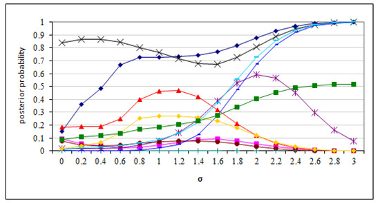 As a starting point, we replicated the experiment performed by Pradhan et al. [10,11] on the Hepar II model. The original experiment focused on the robustness of the posterior probability of each disease to noise in the context of a very large medical diagnostic network, CPCS [12,13]. They transformed the CPCS’ parameters by what we called in Section 2.3 symmetric noise with and found that the posterior probability of the true diagnosis changed little with rising values of , concluding that noise had limited impact on the accuracy of the model.