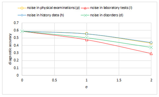 We tested each of the three versions of the Hepar II network (each for a different standard deviation of the noise with 1.0 increments) on the set of test cases and computed its diagnostic accuracy. Figure 8 shows the diagnostic accuracy of the model for noise in each part of the network as a function of . In this figure, h represents the version of the network with noise introduced only to history variables, i.e., those that represent data acquired during an interview with a patient. Similarly, p stands for physical examination, l for laboratory tests, and d for disorders. We can observe that noise in the results of laboratory tests impacts the diagnostic performance of our model most. This is not really surprising, as laboratory tests are highly diagnostic compared to history data and results of physical examination, which are to a large degree subjective. Noise in the disease nodes is also important.