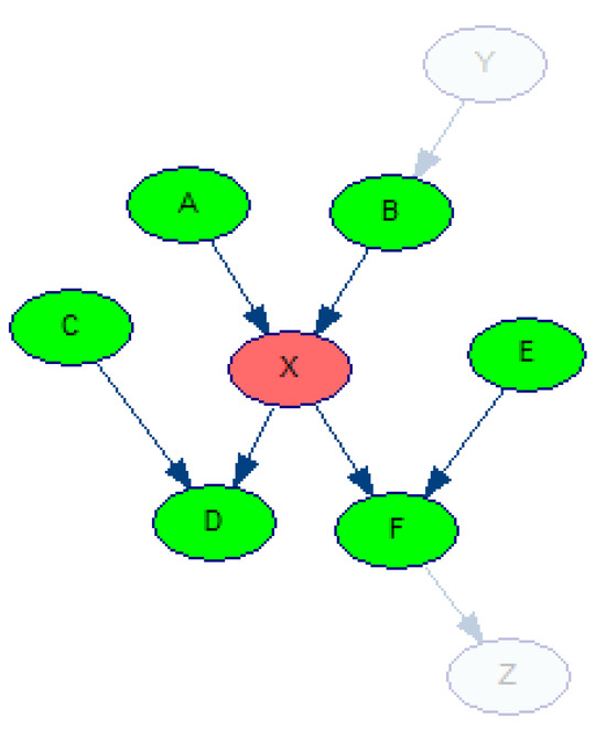 There is an important relationship between a node X and nodes that are not part of X’s Markov blanket. This relationship is described by Equation (5), which shows that the node X is conditionally independent of nodes outside its Markov blanket (nodes Y and Z in Figure 9) given the nodes that belong to its Markov blanket ( = {A, B, C, D, E, F} in Figure 9):