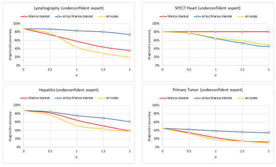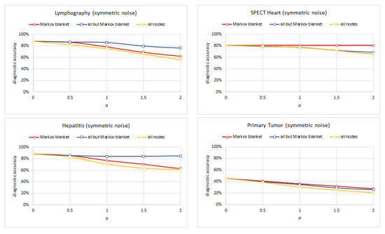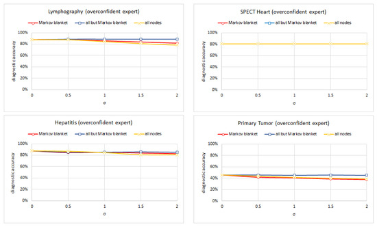 Experiment 3 consisted of testing each of five versions of the following four models: (Lymphography, Spect Heart, Hepatitis, and Primary Tumor) (each for a different standard deviation of the noise with 0.5 increments) on the set of test cases and computed its diagnostic accuracy. We left out the Acute Inflammation, Cardiotocography, and Breast Cancer models because their structure made the Markov blanket trivial. In case of the models learned using the TAN and ABN algorithm, all nodes belong to the Markov blanket of the class node. Hepar II and Acute inflammation models had multiple disease nodes and the set sum of the Markov blankets included all nodes. Figure 10, Figure 11 and Figure 12 show the results of this experiment for symmetric, overconfidence, and underconfidence noise, respectively. Each figure presents three lines corresponding to three models (1) a model with noise introduced into the Markov blanket nodes (red line); (2) a model with noise introduced to all but Markov blanket nodes (blue line); and (3) a model with noise introduced into all nodes (yellow line). Please note that in Figure 11, the top-right chart shows only one line. This is the result of the three lines being almost identical and covering each other. Table 3 summarizes the properties of the Markov blankets of the selected models.
