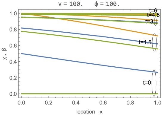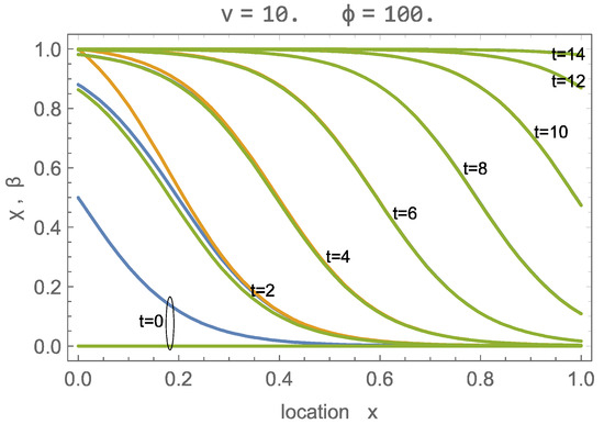 With velocity and diffusivity quite different in size, such that processes are dominated by convection while diffusion can be ignored, we have set from now on.
