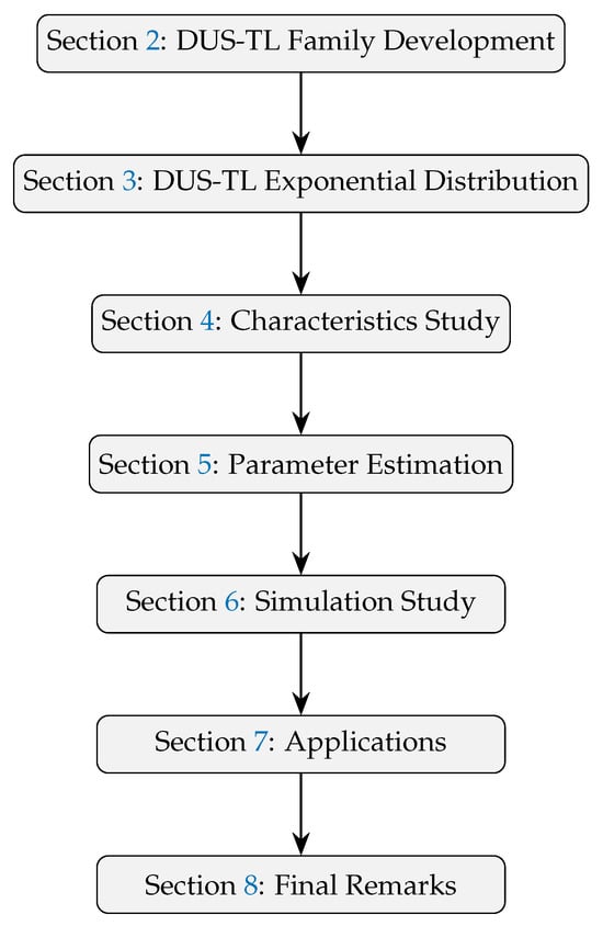The motivation for the development of the new family of distributions in this study ranges from the need to provide models that are parameter parsimonious (lower number of parameters), wider applicability of the attendant new distributions compared to the parent distribution, and improved goodness of fit, estimation adaptability and mathematical flexibility. It is easy to see that the new family formulated in Section 2 did not add any parameters to the Topp–Leone family of distributions; rather, its functional form is altered, rendering a more flexible, adaptable and tractable Topp–Leone family with a better goodness of fit. The remainder of this study is presented in Figure 1 below.