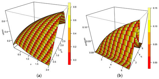 Figure 4a,b represent the mean and variance in 3D graphics. A close observation reveal that for increasing values of the and , the mean becomes large. The peak is at and . Values of cause the mean to depreciate. Similarly, the variance returns to zero for values around 6.