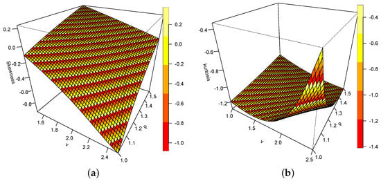 Figure 5a,b are the plots of the skewness and kurtosis of the DUS-TLE distribution. The skewness plot suggests more of a negatively skewed model than positive. However, some values of the measure are positive, which rules out the possibility of only negative skewness. Therefore, there is visual evidence that the distribution can model both negatively and positively skewed data. From Figure 6, as increases and reduces in value, the kurtosis reduces. Conversely, as reduces and increases, the kurtosis increases.