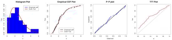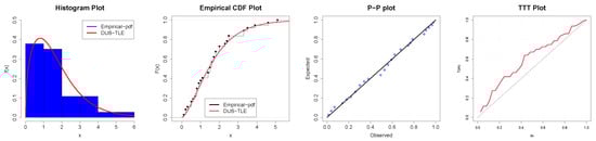 The second application is on overall mortality rates among people who injected drugs studied by Mathers et al. [] and presented in Table 9. In Table 10, the summary statistics are presented which reveal that the skewness measure is 0.02. This is also supported by the theoretical evidence in Figure 5a that the proposed distribution can fit right-skewed data. The kurtosis measure here is 3.689323, which implies leptokurtic data. In Table 11, the fitness measures for the distribution and its competitors are tabulated. The Kolmogorov–Smirnov (KS) statistic p-value for the DUS-TLE distribution is the highest, depicting a better fit to Data-II compared to the competing models. We further show some parametric and non-parametric plots in Figure 7.