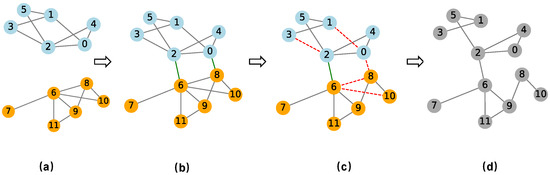Assume that represents the node property of in M, where can be the degree, betweenness, etc., of the node. The probability of link hiding is proportional to the sum of the properties of the nodes connected by the link. Let denote the multilayer node-weighted degree of and let denote the average hiding coefficient of M; then, the sum of hidden edges in M is . The hiding probability of the link between and in M is defined as follows: