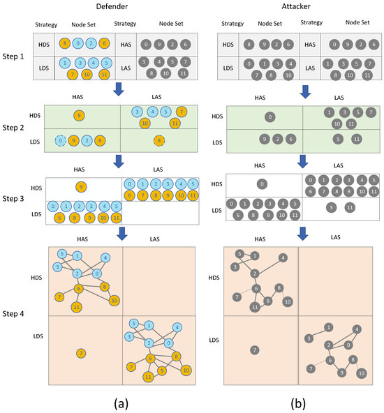 Step 1: According to the attack–defense cost model and resource constraints, the LDS selects nodes [0, 1, 3, 4, 7, 8, 10] and the LAS selects nodes [1, 3, 5, 7, 8, 10, 11].