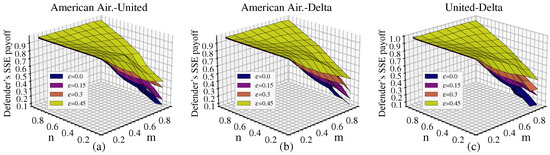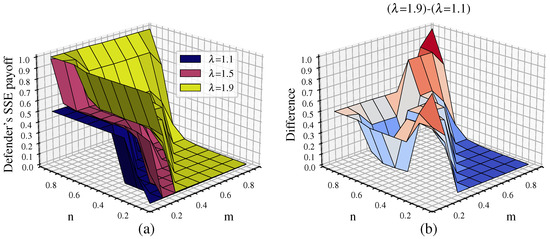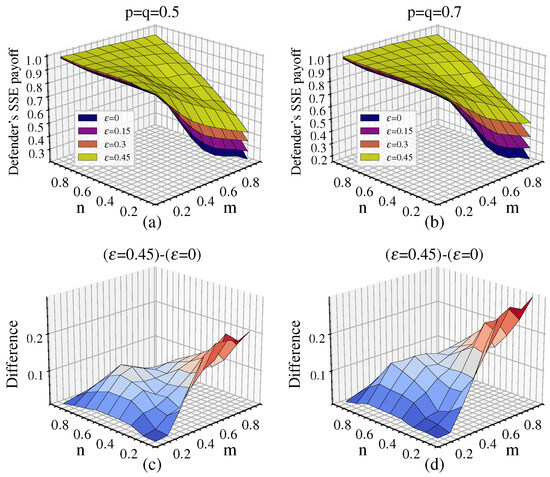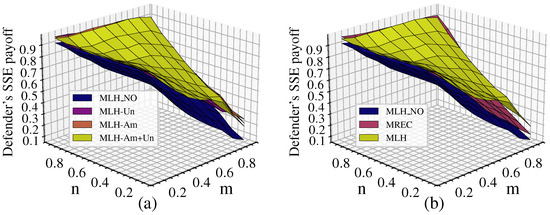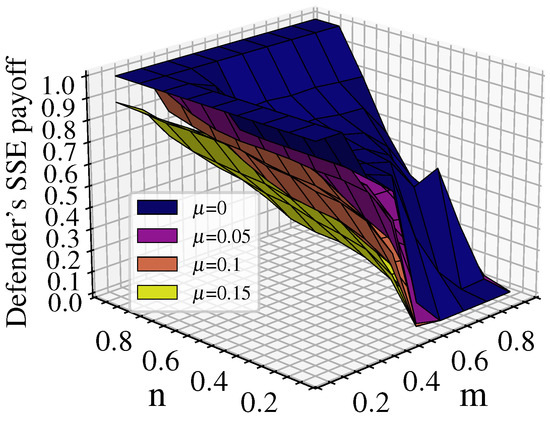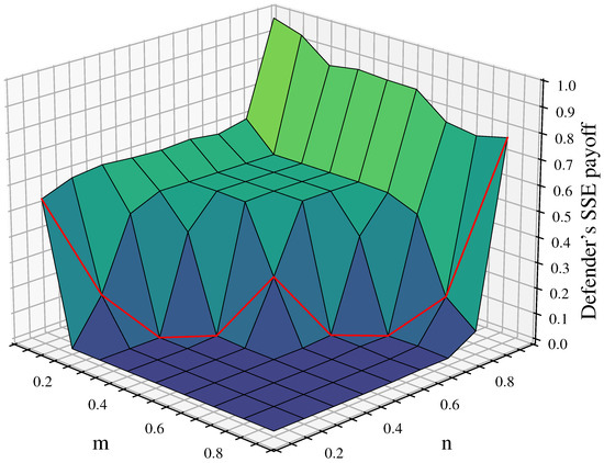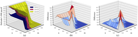 Figure 3a,b show that the defender’s payoff gradually decreases as the available defense resources n decrease. The payoff reaches its maximum in the upper left corner (, ) and its minimum in the lower right corner of both graphs. As increases, the equilibrium payoff increases, indicating that link hiding improves the defender’s payoff. This improvement is particularly significant when n is small and m is large, i.e., when defense resources are at a disadvantage relative to attack resources.