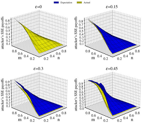 Comparison of the attacker’s expected equilibrium payoff and actual equilibrium payoff for when takes values of 0, 0.15, 0.3, and 0.45. Blue represents the expected equilibrium payoff, while yellow represents the actual equilibrium payoff.