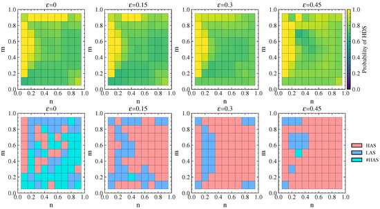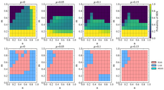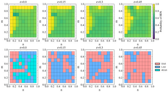 For , the probability of the defender choosing the HDS and the attacker’s equilibrium strategy choice when takes values of 0, 0.15, 0.3, and 0.45. The first row shows the probability of choosing the HDS, where lighter colors indicate higher probabilities of choice, while the second row shows the attacker’s equilibrium strategy choice, with light red representing a high-property attack strategy, light blue a low-property attack strategy, and light green #HAS that the defender’s payoff is the same for both the HAS and LAS.