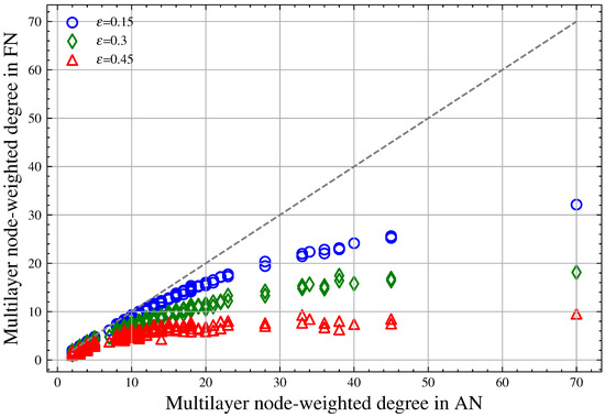 For the coupled two-layer network, we first set to values of 0.15, 0.3, and 0.45. Then, for each , we perform 1000 link hiding experiments to obtain the average value of each node’s weighted degree after changes in this two-layer network. Finally, we examine the relationship between the actual node-weighted degree in the AN network and the false node-weighted degree in the FN network under different values, as shown in Figure 6. The figure shows that link hiding reduces the multilayer node-weighted degree; when takes larger values, it may affect the ranking of multilayer node-weighted degrees, although the effect is relatively small. At the same time, larger results in a further reduction in the multilayer node-weighted degree. For different multilayer node-weighted degrees, nodes with a smaller weighted degree experience smaller reductions, while nodes with a larger weighted degree experience larger reductions.