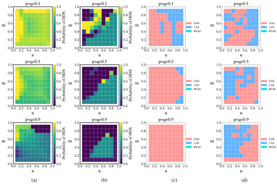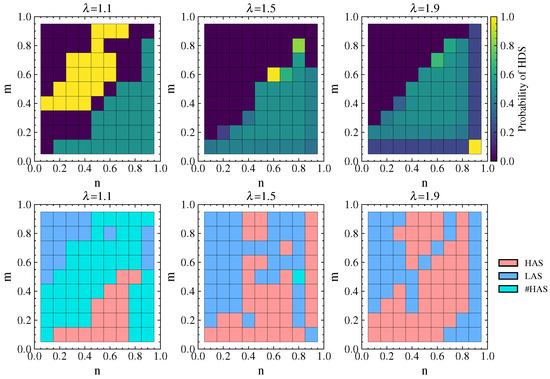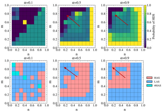 Probability of the defender choosing the HDS and the attacker’s equilibrium strategy choice when takes values of 0.1, 0.5, and 0.9 in the American–United network. The first row shows the probability of choosing the HDS, where lighter colors indicate a higher probability of that choice. The second row shows the attacker’s equilibrium strategy choice, where light red represents the high-property attack strategy, light blue represents the low-property attack strategy, and light green #HAS indicates that the defender’s payoff is the same for both the HAS and LAS.