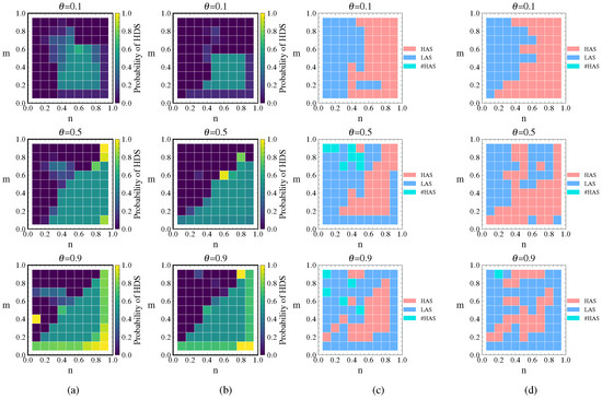 From Figure 23, it can be seen that when defense resources are not dominant, the defender chooses pure LDS strategy. When defense resources are dominant, a pure HDS strategy is chosen. In other cases, a mixed HDS and LDS strategy is chosen, with the respective probabilities both around 0.5. As increases, the choice of a pure LDS strategy increases with . For the attacker, when , the LAS is chosen to counter the defender’s pure strategy and the HAS is chosen to counter the defender’s mixed strategy. As increases, the attacker chooses the HAS more often when . Overall, the strategies under dynamic costs show significant changes compared to those under static costs, while the strategy changes under different dynamic costs are not prominent. This indicates that under cascading failures, dynamic cost changes have a minimal impact on the selection of attack and defense strategies.