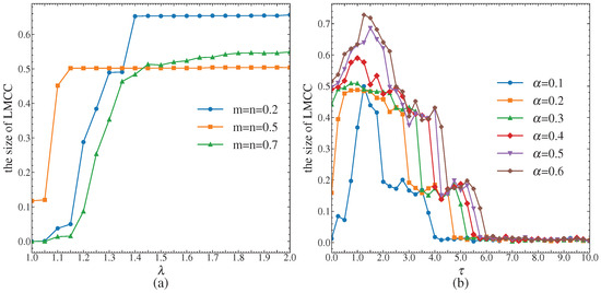 Robustness analysis is generally measured based on the change in network performance before and after node deletion. We define the performance metric for multilayer networks based on the size of the largest connected component (LCC). For multilayer networks, the LCC is extended to the largest mutually connected component (LMCC). If any two nodes in M are connected, then M is called a connected graph. When nodes in M are attacked and removed, the connected graph decomposes into different subgraphs or isolated nodes. The largest connected subgraph of M is defined as the LMCC. To reflect the impact of cascading failures on network performance, we define the sum of the load on all nodes in the LMCC as ; then, we have , where is the set of nodes in the LMCC.