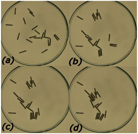 Aggregation in a system of polylactic acid rods driven by capillary forces. The rods are mm long and have diameter mm. They were placed on the water surface of a Petri dish with 10 cm diameter. Subfigures (a–d) correspond to times s (the initial distribution of rods on the water), s, s, and s, respectively.