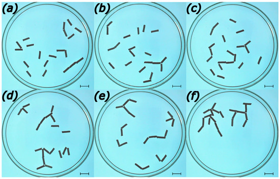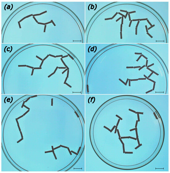 The metastable aggregates observed at the end of experiments. Subfigures (a–c,e) correspond to times min, min, min, and min. The structure shown in (d) ( min) aggregated after dispersing an existing structure to single rods, i.e., 12 min after a concluded 60 min experiment. The structure in (f) ( min was formed in a smaller Petri dish with the diameter cm. The freeze frames depicted were cropped in order to show the full extent of aggregates and all scale bars are 10 mm.