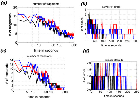Qualitative analysis of the number of fragments as a function of time in systems of 20 self-propelled rods ( mm, mm) aggregating inside 12 cm Petri dish: (a) the total number of fragments; (b) the number of birods; (c) the number of monorods; (d) the number of trirods. The results were obtained from the time evolution leading to metastable structures illustrated in Figure 4b,c,e (red, blue and black curves, respectively).