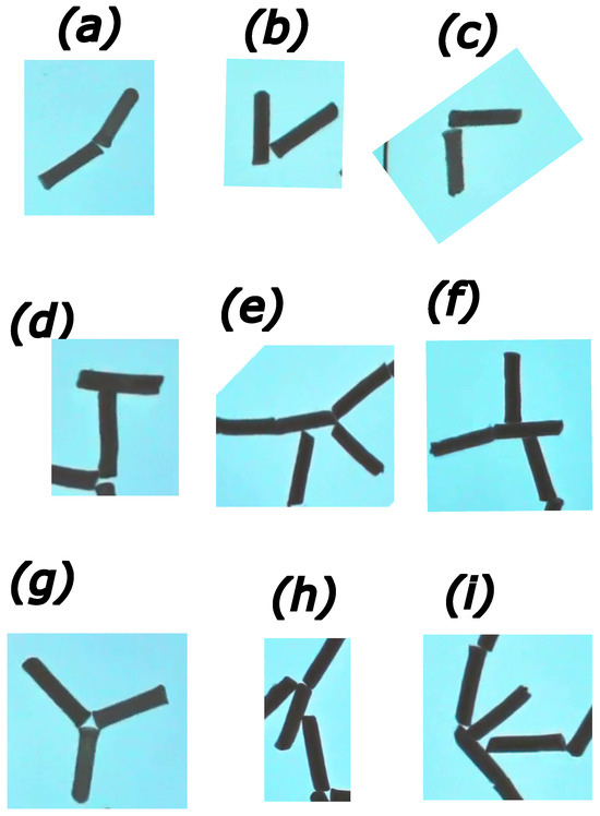 An alternative method of aggregate description is based on a list of frequently observed connections between rods. This technique uses the idea of information coding, relating the most common strings with simple symbols [53]. Here, we can apply the idea to classify connections between rods. We observed that the rods can form end-to-end and end-to-center junctions. The parallel connection so common for aggregation with capillary forces (cf. Figure 1) does not appear. Most of the observed connections are between two rods. Connections involving three rods are less frequent. We also observed occasional connections between four rods; the number of them is small, still special symbols should be introduced to code them. The examples of symbol coding are shown in Figure 5. The most common element of aggregates is an end-to-end junction of two rods at an angle close to straight (I junction). Another common junction of two rods is a junction at a right angle ( junction or its rotated version ℸ). Yet another junction seen in metastable aggregates is the joining of two rods at an acute angle (V junction). The junctions between two rods where one rod joins the center of the other are less frequent. If rods join at a right angle, we call it a T junction, and when the angle is acute, we name it . The end-to-end connections can also occur between three rods, giving a Y junction. Junctions T, V, Y, or can lead to aggregate branching. We can use the previously described idea of bracketing the parts. The symbol denotes strings originating from the left, central, and right positions on the upper bar. A single rod attached should be coded with separate symbols, for example, 1. Similarly we can use and to code branches aggregating from left and right arms, respectively.