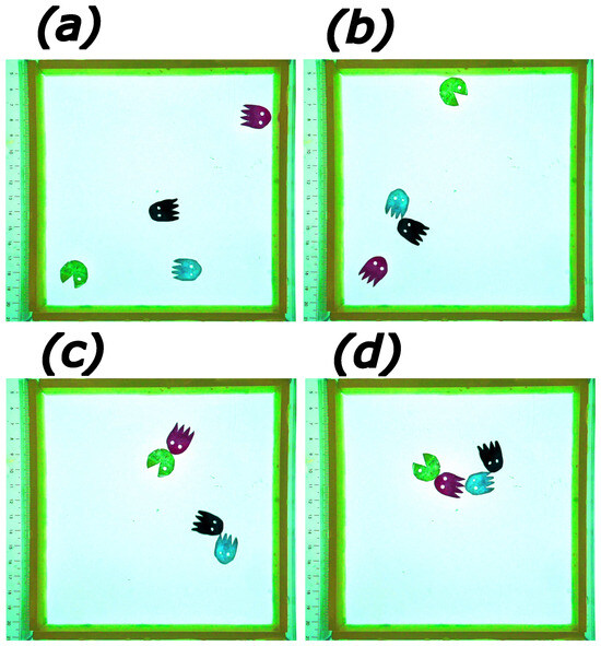 Aggregation of PacMan [54] characters made of camphene–camphor–polypropylene plastic floating on water surface inside square-shaped cm area. Subfigures (a–d) correspond to the times 8, 17, 23, and 26 s. The movie illustrating the time evolution can be watched on YouTube ([56]).