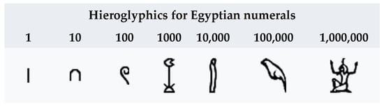 - Ifrah, G. The Universal History of Numbers: From Prehistory to the Invention of the Computer; John Wiley & Sons: New York, NY, USA, 1981; ISBN 0-471-37568-3. [Google Scholar]