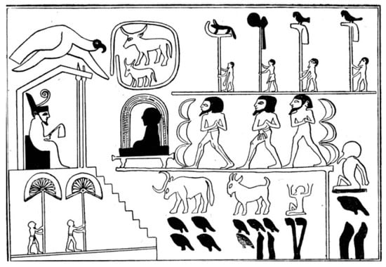 The Egyptian number system was additive. Large numbers were represented by collections of the glyphs []. The impressive evidence of the use of the base 10 number system can be found on the Narmer Macehead [], which depicts offerings of 400,000 oxen, 1,422,000 goats and 120,000 prisoners (See Figure 2).