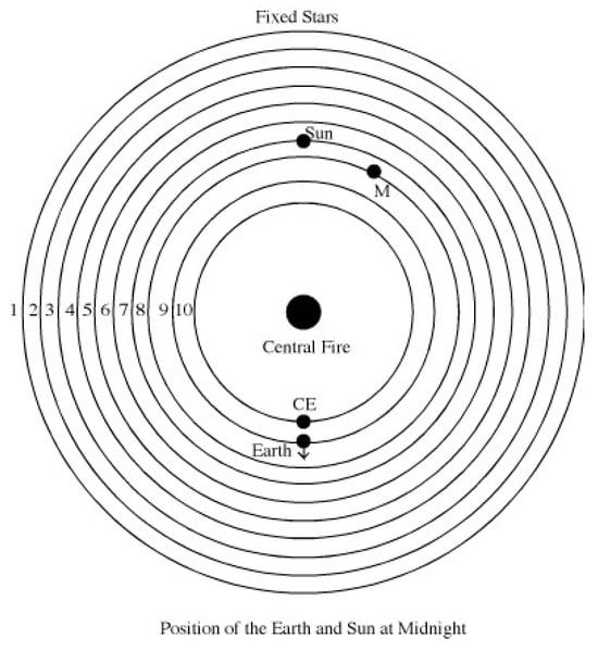 The incomplete diagram of the model of the universe proposed by Philolaus of Croton. We see only Central Fire, Sun Moon, Earth and CE (Anticthon–Counter Earth. Five more distant, known planets and the celestial sphere of stars are missing. The existence of Anticthon helped explain the diurnal cycle []. At midnight CE is blocking completely the light coming from the Sun.