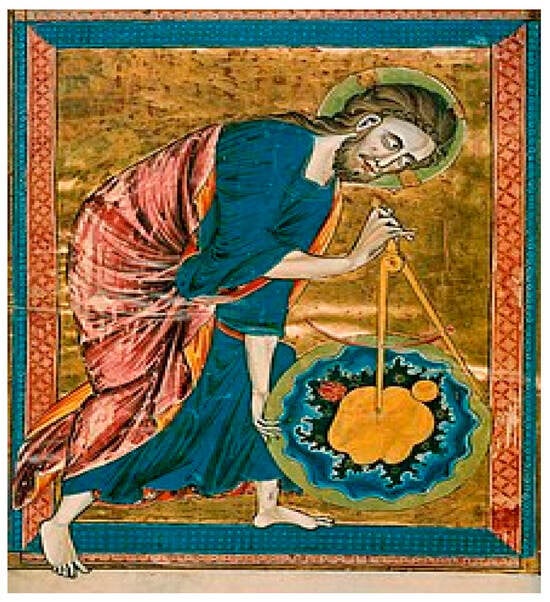 God the Geometer—Gothic frontispiece of the Bible moralized, representing God’s act of Creation. France, mid-13th century.