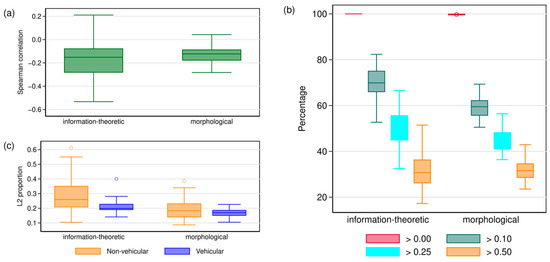 Descriptive results of KEW’s multiple imputation approach. Per type of complexity (information-theoretic or morphological), computations are based on the 100 completed samples from KEW’s multiple imputation analysis. (a) Spearman correlation between the imputed L2 proportion and speaker population size and (b) percentage of languages that have an L2 proportion of (i) more than 0, (ii) more than 0.10, (iii) more than 0.25 and (iv) more than 0.50 per type of complexity (information-theoretic or morphological). (c) Median L2 proportion for non-vehicular and vehicular languages per type of complexity.