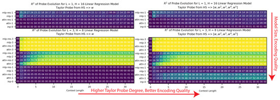 Encoding quality is tied to model performance. As shown in Appendix A Figure A3, we found that the better-performing models generally had stronger encodings of . As shown in Figure 3, we also found that the improvements in model prediction as a function of context length, or in-context learning, were correlated to improvements in ’s encoding, which we would expect if our models were using in their computations.