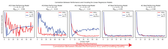 We tested the correlation between model performance and the encoding of on 5 of our 25 linear regression models of evenly spaced performance quality. We plotted normalized values for the error of the encoding () in red and the mean squared error of the model () in blue. We found that the ability of the best-performing models to in-context learn was highly correlated with their encoding of (.