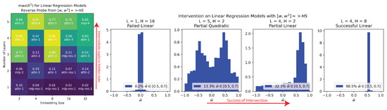 Left: We plotted of the reverse probe from across all the linear regression models, and we found that the intermediate could explain significant amounts of variance in the model hidden states. Right: We intervened, using reverse probes to make all the models output . This intervention failed (16/25), it was partially successful nonlinearly (2/25) or linearly (3/25), or it was successful (4/25). We noted the empirically observed as calculated by where was the output of the intervened transformer and x was the input.