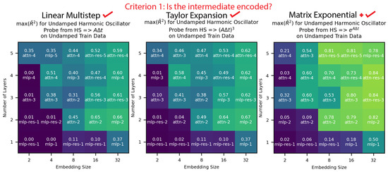 Criterion 1: Is the intermediate encoded? In Figure 5, we see that all three intermediates were well encoded in the model, with the matrix exponential method especially prominent. This provides initial correlational evidence that the models were learning numerical methods. The magnitude of the encodings was generally smaller than the linear regression case, which we attribute to the increased difficulty of encoding matrices compared to a single weight value . Notably, we only probed for linear encodings, given that was most often encoded linearly in the linear regression case study: