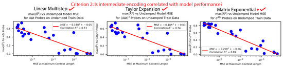 We see that, generally, the better-performing models exhibited stronger encodings of intermediates, while the worse-performing models exhibited weaker encodings. These trends were not as strong as the undamped case, shown in Figure 6. Like criterion 1 in Figure A10, we see that the linear multistep method was competitive with the matrix exponential method.