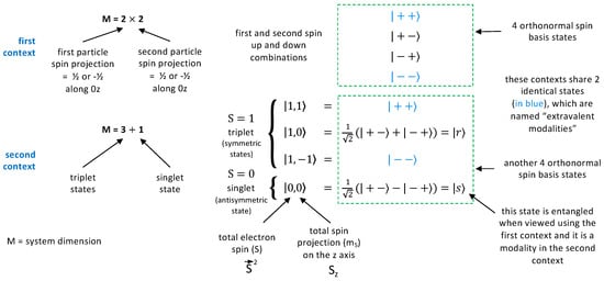 Various quantum states relevant for two electrons. All mean . The total spin is the sum of the squares of the three spin projections and it takes the values . In this figure, M is the total number of possible, mutually exclusive measurement outcomes—or modalities—in each context.