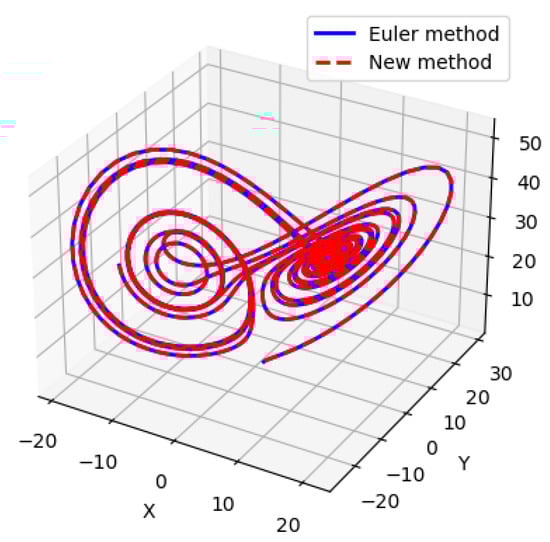 To show the efficiency of the proposed method, we compare the results of our proposed method and the Euler method, which is a nonlinear approach, to solve the Lorenz system. We use the same number of iterations, step size, and initial point. We plot this compression in Figure 3.
