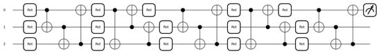 - Entangling operations: Following the rotation gates, to entangle the qubits, a series of controlled-NOT (CNOT) gates are applied. The pattern of these CNOT gates may vary, but they generally ensure that every qubit is entangled with at least one other qubit in the layer.
