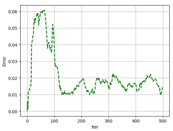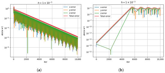 First, we examine the computation shown on the left side of Figure 1. The starting point is . Figure 9a shows the error in the computation of and in each iteration and the total error (defined as the sum of individual errors). It is evident that equation system (22) solved by using the classical approach has good accuracy. The average total error is the same for a step size of . The error decreases as the number of iterations increases.