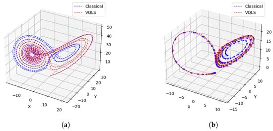 For two different starting points, the trajectories computed by using the classical and the VQLS methods are shown in Figure 8. Both approaches compute similar trajectories. The chaotic system appears to have more error compared with the attractor.