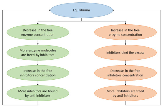 Additionally, the model presented here parallels the concept explored in earlier experiments with a hammerhead ribozyme [52]. The key distinction, however, is that in the previous study, the control mechanisms relied solely on the concentration of specific molecules. In contrast, the current model introduces the possibility of regulation through inhibitor–anti-inhibitor interactions, offering a more sophisticated layer of control.
