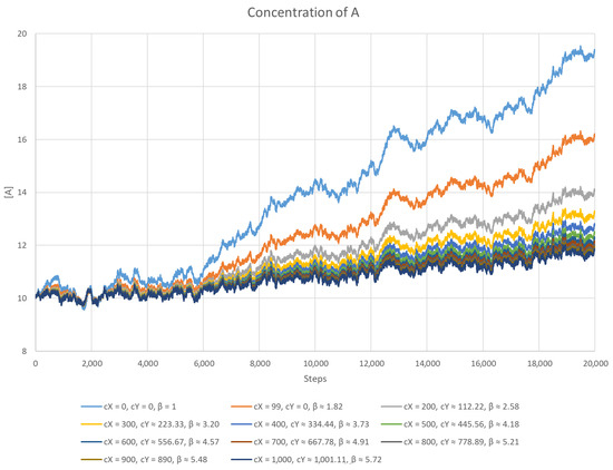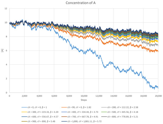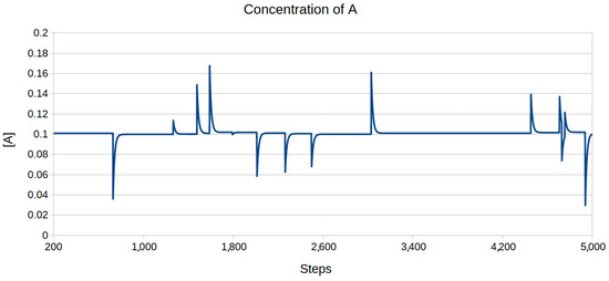 One of the scenarios which had to be tested is how the inhibitors can manage the growing population of self-replicating RNA molecules. In this case, the equations were also simulated directly, but another modification was introduced instead of the noise function—the agent A was given the ability to self-replicate, that is, it always tried to gradually increase its numbers. It was achieved by modifying Equation (31) by adding two additional processes: replication (of rate ) and decay (of rate ). The modified version can be written as follows:
