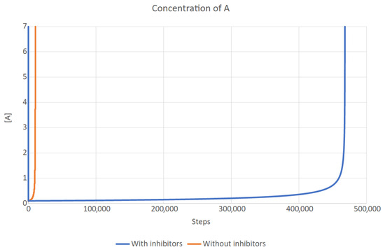 The concentrations of A over time with and without inhibitors. In the latter case, the population quickly grows out of control, while in the former, it remains stable for a long time, although it also explodes eventually.