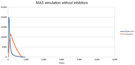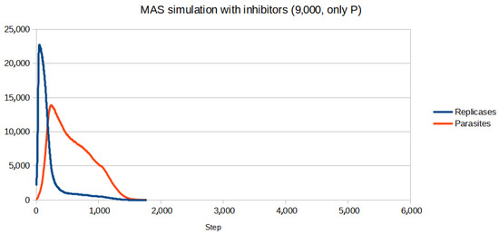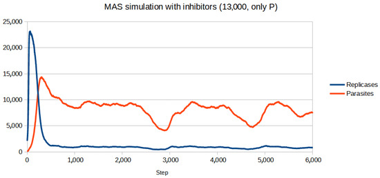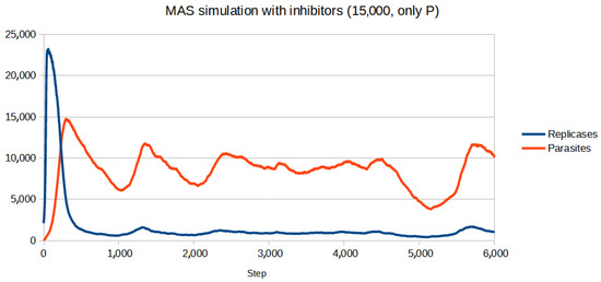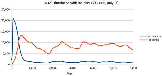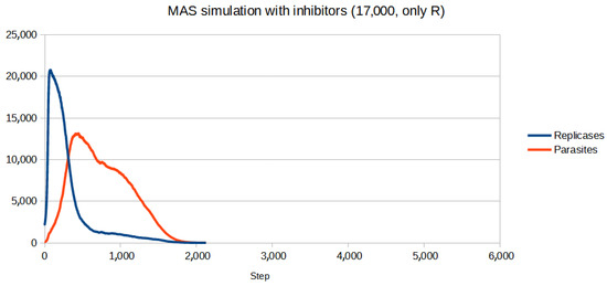Figure 11. The first value which allowed the system to survive when only replicases were blocked was 19,000 of inhibitors. It was a significantly higher number than that of parasites.