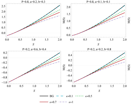 The mass parameter M as a function of entropy S for a different values of the parameter. The Boltzmann–Gibbs (BG) characteristics are marked by a black line (). The diagrams have been drawn for different pressure values, and VdW constants a and b.