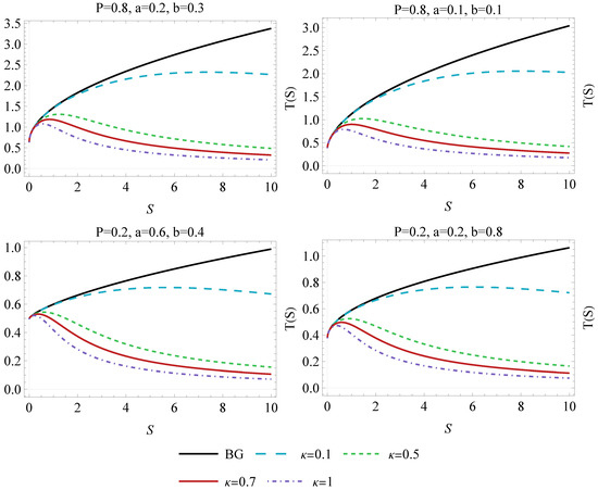 Thermodynamic temperature T as a function of entropy S for different values of the parameter. The diagrams have been plotted for different values of P, a and b. The behavior is compared to the BG entropy ().