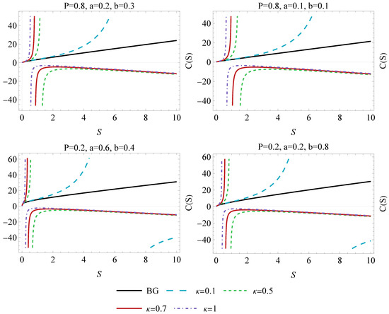 The numerator of the expression, , consists of terms dependent on , a, b, and P, reflecting the influence of Kaniadakis entropy, intermolecular forces, molecular pressure, and on the heat capacity. Additionally, the complexity of the denominator underscores the intricate interplay between these parameters in shaping the heat capacity. The behavior of the heat capacity under the different values of is presented in Figure 3. Notably, a change in sign corresponds to the presence of divergent and physical limitation points, indicating a phase transition process, either a second-order or a first-order phase transition, respectively. Note that for the certain values of and S, the heat capacity indicates the local instability of a VdW BH. On the other hand, for , the BH eventually will be stable, as the diagram will approach the standard characteristics of the VdW BH [22,47].
