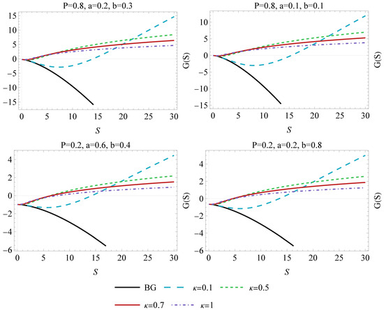 The functional behavior of the Gibbs free energy in the form of the diagram has been shown in the Figure 4. Note that as increases, the curves become steeper, particularly at higher entropy values. This reflects that larger values tend to amplify the deviations from the usual thermodynamic behavior [8,22,47]. The analysis reveals that the in Van der Waals black holes is highly sensitive to the Kaniadakis entropy parameter and the Van der Waals parameters a and b. Negative values of Gibbs energy, particularly at small values of entropy, suggest the potential for phase transitions or thermodynamic instability. This effect is more pronounced for larger values of a and lower pressure. Additionally, as entropy increases, the system generally becomes more stable. However, strong interactions (larger a) and low pressure can lead to complex, potentially unstable, thermodynamic states at low entropy.