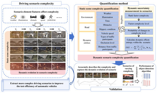 Therefore, this paper proposes the Static Scene Complexity Quantification (SSCQ) method, which comprehensively considers the impacts of environmental conditions, road conditions, and dynamic entities on scene complexity. Additionally, it analyzes the correlation among factors within each dimension. On this basis, the information entropy [27] is introduced to measure the dynamic changes of scene elements, thereby quantifying the uncertainty added to scenarios due to changes in complexity. Consequently, the Dynamic Scenario Complexity Quantification (DSCQ) method is proposed. Furthermore, we validate the quantification results by correlating them with the performance of object detection algorithms. Figure 1 shows the flow of this work. Notably, this quantification framework is flexible and extensible, allowing for the inclusion of additional evaluation dimensions and indicators in the future.