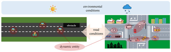 Types of Traffic Participants (TPs): Different types of TPs, such as cars, bicycles, and pedestrians, each have different behavior patterns and interaction modes, which imposes various requirements on the AV’s perception and decision-making system; for example, pedestrian behavior is more random, while cars follow traffic rules.