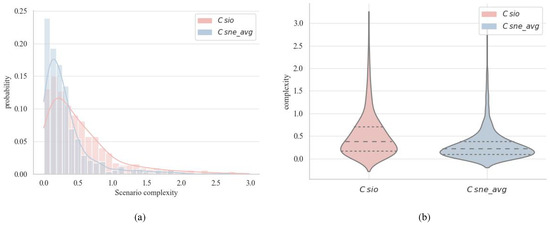 To further demonstrate DSCQ’s ability to capture the effect of dynamic changes on scenario complexity, the average scene complexity within each scenario unit, denoted as , was calculated and compared against the quantification results of . The probability distribution and violin plot depicted in Figure 4 illustrates that and exhibit similar overall trends in the quantification of scenario complexity, with the majority of scenarios having relatively low complexity. However, the quantification results of SSCQ tend to cluster more towards lower complexity levels compared to DSCQ, potentially overlooking numerous highly intricate scenarios characterized by significant dynamic fluctuations. In comparison, adapts to the dynamic evolution of scenarios and identifies a broader range of complex scenarios.